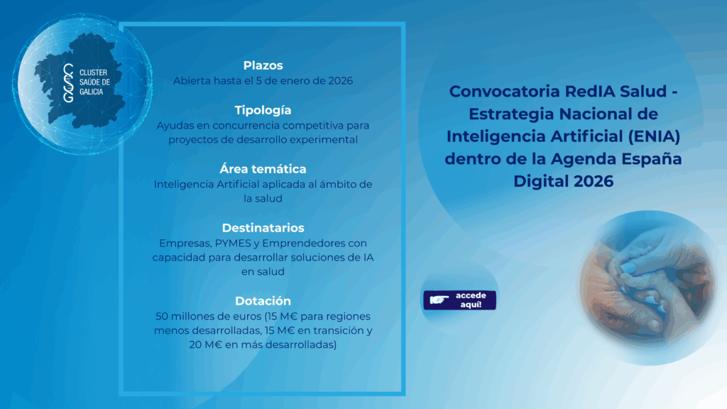 - RedIA Salud – Estrategia Nacional de Inteligencia Artificial (ENIA) dentro de la Agenda España Digital 2026, con financiación de Fondos Europeos FEDER – Fin del plazo: 05/01/2026