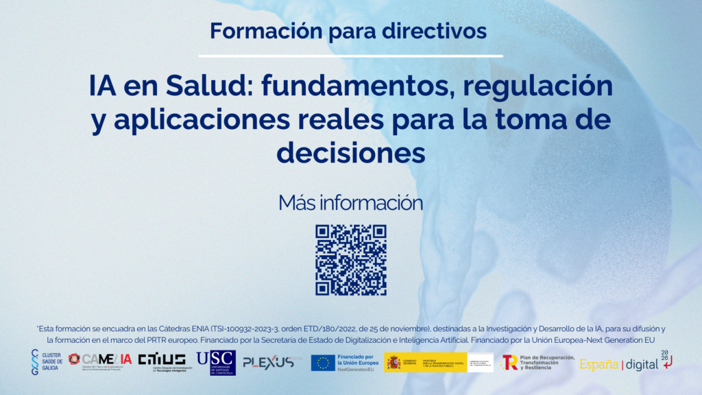 Esta formación en Inteligencia Artificial aplicada a la salud, impulsada por el Cluster Saúde de Galicia junto con la Cátedra USC-Plexus de IA en Medicina Personalizada de Precisión (CAMELIA), está dirigida específicamente a directivos y responsables de organizaciones sanitarias, tanto del ámbito público como privado.
